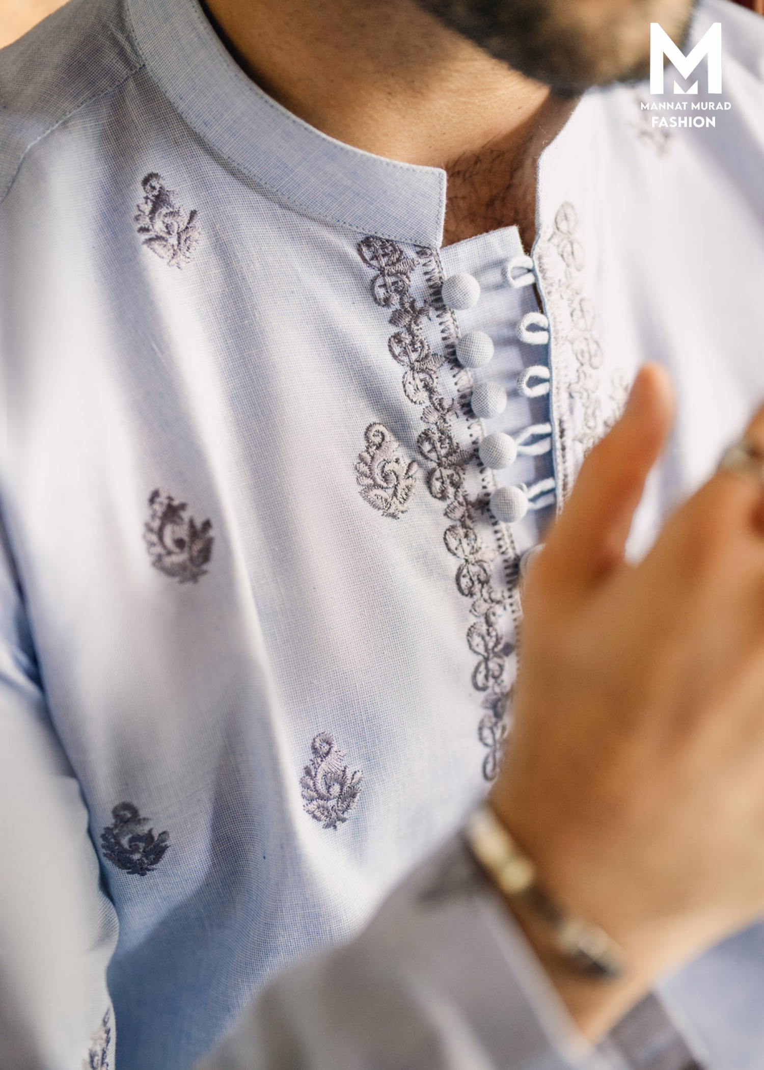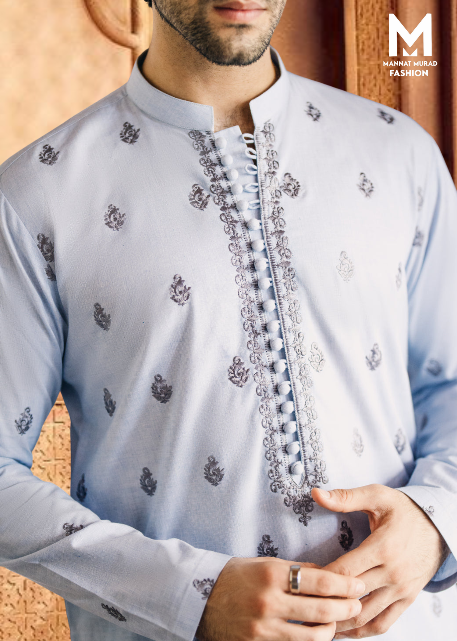 M-10020 Sky Blue Damask Pattern Kurta Pajama
